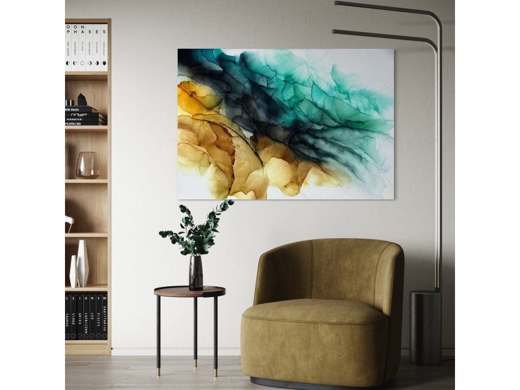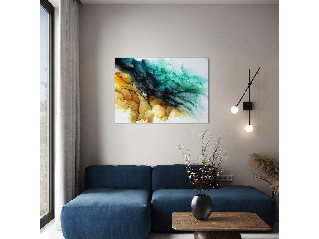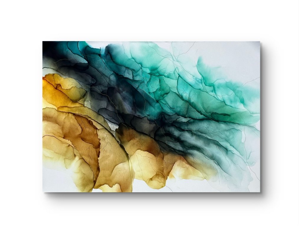 Jemná symfonie přírodních živlů… zemitá hněď se prolíná s tyrkysovými a smaragdovými odstíny, které připomínají oceán, nebo proudy energie. Je to jako pohled na krajinu, kterou člověk nevidí očima, ale cítí vnitřně.